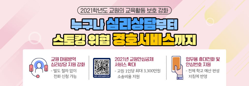 ▢ 서울특별시교육청(교육감 조희연)은 코로나19 방역 일선에서 교육현장을 지키는 교원들이 안심하고 교육 활동에 전념할 수 있도록 △교원 마음방역 심리상담 지원 강화 △『교원안심공제』 서비스 대폭 확대 △단위학교 교육활동 보호 사업 적극 지원 등으로 교원의 교육활동 보호 정책을 종합적으로 강화한다.